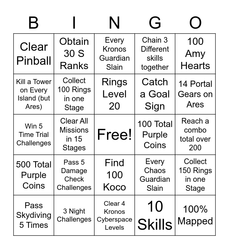 This bingo card has a free space and 161 words: Defeat Giganto, Dodge Giganto's giant laser beam, Curbstomp Giganto with Grand Slam, Defeat Wyvern, Mario 64 Wyvern into a Mountain, Defeat Knight, Ride Knights Shield into Him Twice, Defeat Supreme, Cyloop Supreme And Cyloop Spike Him Down, Kill a Ninja on Every Island (but Ares), Kill a Tower on Every Island (but Ares), 12 Unique Guardians Slain, Every Kronos Guardian Slain, Every Ares Guardian Slain, Every Chaos Guardian Slain, Every Ouranos Guardian Slain, Defeat every Squid, All Amy Side Stories, All Knuckles Side Stories, All Tails Side Stories, All Sage Side Stories on Kronos, All Sage Side Stories on Ares, All Sage Side Stories on Chaos, All Sage Side Stories on Ouranos, Grave Puzzle, Crane Puzzle, Clear Pinball, Form the Bridge on Ouranos, Open the White Emerald Vault on Ouranos, 4 Kronos Emeralds, 4 Ares Emeralds, 4 Chaos Emeralds, 4 Ouranos Emeralds, All Kronos Emeralds, All Ares Emeralds, All Chaos Emeralds, All Ouranos Emeralds, 7 Portal Gears on Kronos, 12 Portal Gears on Kronos, 8 Portal Gears on Ares, 14 Portal Gears on Ares, 9 Portal Gears on Chaos, 16 Portal Gears on Chaos, 12 Portal Gears on Ouranos, 20 Portal Gears on Ouranos, 30 Vault Keys on Kronos, 45 Vault Keys on Kronos, 30 Vault Keys on Ares, 45 Vault Keys on Ares, 30 Vault Keys on Chaos, 45 Vault Keys on Chaos, 40 Vault Keys on Ouranos, 55 Vault Keys on Ouranos, 10 Skills, Unlock Quick Cyloop, Unlock Loop Kick, Unlock Auto Combo, Unlock Every Skill, Destroy an enemy with Phantom Rush, Reach a combo total over 100, Reach a combo total over 200, Chain 3 Different skills together, Defeat an enemy with Recovery Smash, Catch a Fish on Every Island, Catch Golden Coelecanth, Catch a Goal Sign, Catch a Ring, Catch a Golden Chest, Get Both Koco Scrolls for One Island, 100 Total Purple Coins, 200 Total Purple Coins, 300 Total Purple Coins, 400 Total Purple Coins, 500 Total Purple Coins, Find 50 Koco, Find 75 Koco, Find 100 Koco, Find 150 Koco, Find 200 Koco, Drown in a Bloop, Hear 5 Random Comments From Sonic, Let an emerald be stolen from you, 7 Cacti Fireworks, Clear 3 Trees of Leaves, Win Triple Bar Slots in Starfall, Splat into THE END, Power Level 50, Power Level 99, Defense Level 50, Defense Level 20, Speed Level 20, Speed Level 40, Rings Level 20, Rings Level 40, 100 Amy Hearts, 300 Knuckles Medals, 200 Tails Wrenches, 250 Sage Hearts, Sidestep Mastery 5 Times, Shoot A Ball Through a Hoop 5 Times, Win Tetris 3 Times, 3 Night Challenges, Pass Skydiving 5 Times, Win 5 Time Trial Challenges, Pass 5 Damage Check Challenges, Destroy 3 Bubbles, Destroy 3 Buzzsaws, Cyloop 5 Soldiers at once, 3 Laser Turret Enemies, 5 Spring Enemies, 3 Eagles, Defeat 12 Doggos, Fly an Eagle to another island, Climb the volcano, Ride a completed Ancients Rail across an Island, Get to the highest part of Kronos Tower, Climb the pyramid on Ouranos, Climb to the highest natural mountain on Ares, Clear 4 Kronos Cyberspace Levels, Clear Every Kronos Cyberspace Level, Clear 4 Ares Cyberspace Levels, Clear Every Ares Cyberspace Level, Clear 4 Chaos Cyberspace Levels, Clear Every Chaos Cyberspace Level, Clear 5 Ouranos Cyberspace Levels, Clear every Ouranos Cyberspace Level, Obtain 10 S Ranks, Obtain 15 S Ranks, Obtain 20 S Ranks, Obtain 25 S Ranks, Obtain 30 S Ranks, Get Every Red Ring Mission 10 times, Get Every Red Ring Mission 15 times, Get Every Red Ring Mission 20 times, Get Every Red Ring Mission 25 times, Get Every Red Ring Mission 30 times, Collect 50 Rings in one Stage, Collect 100 Rings in one Stage, Collect 150 Rings in one Stage, Collect 200 Rings in one Stage, Clear All Missions in 5 Stages, Clear All Missions in 10 Stages, Clear All Missions in 15 Stages, Clear All Missions in 20 Stages, Clear All Missions in 25 Stages, 50% Mapped, 100% Mapped, 50% Mapped, 100% Mapped, 50% Mapped, 100% Mapped, 50% Mapped, 100% Mapped, 50% completion on Kronos, 100% completion on Kronos, 50% completion on Ares, 100% completion on Ares, 50% completion on Chaos, 100% completion on Chaos, 50% completion on Ouranos and 100% completion on Ouranos.
