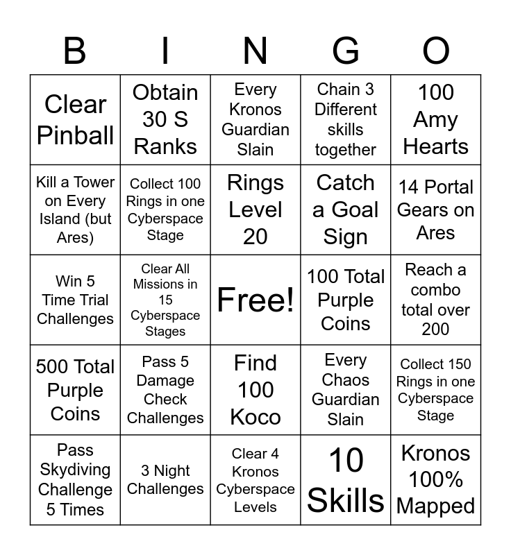 This bingo card has a free space and 161 words: Defeat Giganto, Dodge Giganto's giant laser beam, Curbstomp Giganto with Grand Slam, Defeat Wyvern, Mario 64 Wyvern into a Mountain, Defeat Knight, Ride Knights Shield into Him Twice, Defeat Supreme, Cyloop Supreme And Cyloop Spike Him Down, Kill a Ninja on Every Island (but Ares), Kill a Tower on Every Island (but Ares), 12 Unique Guardians Slain, Every Kronos Guardian Slain, Every Ares Guardian Slain, Every Chaos Guardian Slain, Every Ouranos Guardian Slain, Defeat every Squid, All Amy Side Stories, All Knuckles Side Stories, All Tails Side Stories, All Sage Side Stories on Kronos, All Sage Side Stories on Ares, All Sage Side Stories on Chaos, All Sage Side Stories on Ouranos, Grave Puzzle, Crane Puzzle, Clear Pinball, Form the Bridge on Ouranos, Open the White Emerald Vault Door on Ouranos, 4 Kronos Emeralds, 4 Ares Emeralds, 4 Chaos Emeralds, 4 Ouranos Emeralds, All Kronos Emeralds, All Ares Emeralds, All Chaos Emeralds, All Ouranos Emeralds, 7 Portal Gears on Kronos, 12 Portal Gears on Kronos, 8 Portal Gears on Ares, 14 Portal Gears on Ares, 9 Portal Gears on Chaos, 16 Portal Gears on Chaos, 12 Portal Gears on Ouranos, 20 Portal Gears on Ouranos, 30 Vault Keys on Kronos, 45 Vault Keys on Kronos, 30 Vault Keys on Ares, 45 Vault Keys on Ares, 30 Vault Keys on Chaos, 45 Vault Keys on Chaos, 40 Vault Keys on Ouranos, 55 Vault Keys on Ouranos, 10 Skills, Unlock Quick Cyloop, Unlock Loop Kick, Unlock Auto Combo, Unlock Every Skill, Destroy an enemy with Phantom Rush, Reach a combo total over 100, Reach a combo total over 200, Chain 3 Different skills together, Defeat an enemy with Recovery Smash, Catch a Fish on Every Island, Catch Golden Coelecanth, Catch a Goal Sign, Catch a Ring, Catch a Golden Chest, Get Both Koco Scrolls for One Island, 100 Total Purple Coins, 200 Total Purple Coins, 300 Total Purple Coins, 400 Total Purple Coins, 500 Total Purple Coins, Find 50 Koco, Find 75 Koco, Find 100 Koco, Find 150 Koco, Find 200 Koco, Drown in a Bloop, Hear 5 Random Comments From Sonic, Let an emerald be stolen from you, 7 Cacti Fireworks, Clear 3 Trees of Leaves, Win Triple Bar Slots in Starfall, Splat into THE END, Power Level 50, Power Level 99, Defense Level 50, Defense Level 20, Speed Level 20, Speed Level 40, Rings Level 20, Rings Level 40, 100 Amy Hearts, 300 Knuckles Medals, 200 Tails Wrenches, 250 Sage Hearts, Sidestep Mastery Challenge 5 Times, Shoot A Ball Through a Hoop Challenge 5 Times, Win Tetris 3 Times, 3 Night Challenges, Pass Skydiving Challenge 5 Times, Win 5 Time Trial Challenges, Pass 5 Damage Check Challenges, Destroy 5 Bubble Enemies, Destroy 3 Buzzsaw Enemies, Cyloop 5 Soldiers at once, Destroy 5 Laser Turret Enemies, Destroy 5 Spring Enemies, Destroy 5 Eagles Enemies, Defeat 12 Doggo Enemies, Fly an Eagle to another island on Chaos, Climb the volcano on Chaos, Ride a completed Ancients Rail across an Island, Get to the highest part of Kronos Tower, Climb the pyramid on Ouranos, Climb to the highest natural mountain on Ares, Clear 4 Kronos Cyberspace Levels, Clear Every Kronos Cyberspace Level, Clear 4 Ares Cyberspace Levels, Clear Every Ares Cyberspace Level, Clear 4 Chaos Cyberspace Levels, Clear Every Chaos Cyberspace Level, Clear 5 Ouranos Cyberspace Levels, Clear every Ouranos Cyberspace Level, Obtain 10 S Ranks, Obtain 15 S Ranks, Obtain 20 S Ranks, Obtain 25 S Ranks, Obtain 30 S Ranks, Get Every Red Ring Mission 10 times, Get Every Red Ring Mission 15 times, Get Every Red Ring Mission 20 times, Get Every Red Ring Mission 25 times, Get Every Red Ring Mission 30 times, Collect 50 Rings in one Cyberspace Stage, Collect 100 Rings in one Cyberspace Stage, Collect 150 Rings in one Cyberspace Stage, Collect 200 Rings in one Cyberspace Stage, Clear All Missions in 5 Cyberspace Stages, Clear All Missions in 10 Cyberspace Stages, Clear All Missions in 15 Cyberspace Stages, Clear All Missions in 20 Cyberspace Stages, Clear All Missions in 25 Cyberspace Stages, Kronos 50% Mapped, Kronos 100% Mapped, Ares 50% Mapped, Ares 100% Mapped, Chaos 50% Mapped, Chaos100% Mapped, Ouranos 50% Mapped, Ouranos 100% Mapped, 50% Kronos Fishing, 100% Kronos Fishing, 50% Ares Fishing, 100% Ares Fishing, 50% Chaos Fishing, 100% Chaos Fishing, 50% Ouranos Fishing and 100% Ouranos Fishing.