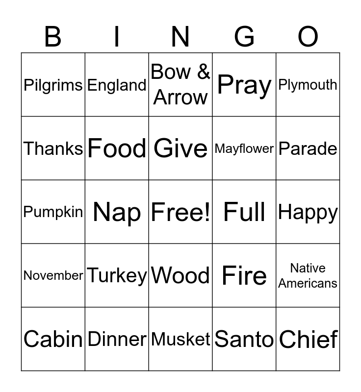This bingo card has a free space and 24 words: Turkey, Dinner, Give, Cabin, Plymouth, Pilgrims, Thanks, England, Full, Wood, Mayflower, Pumpkin, Fire, Native Americans, Food, Santo, Happy, Bow & Arrow, Parade, Nap, Chief, November, Pray and Musket.