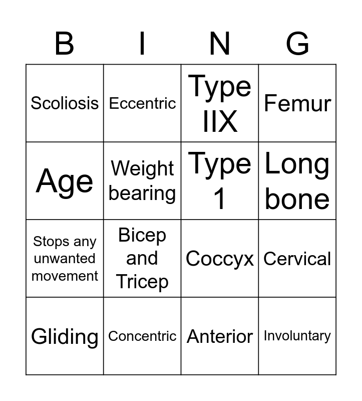 This bingo card has 20 words: Cervical, increased muscle pliability, Type IIX, reduces friction across a joint, Gliding, Age, Concentric, Scoliosis, Stops any unwanted movement, Eccentric, Bicep and Tricep, Coccyx, Weight bearing, Involuntary, Type 1, Muscle hypertrophy, Long bone, Femur, Anterior and Isometric.