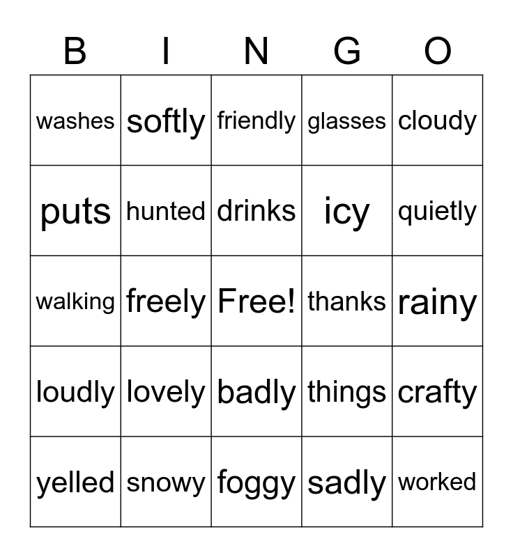 This bingo card has a free space and 24 words: lovely, snowy, drinks, yelled, cloudy, washes, puts, softly, thanks, badly, icy, walking, things, crafty, hunted, sadly, rainy, friendly, quietly, freely, worked, loudly, glasses and foggy.