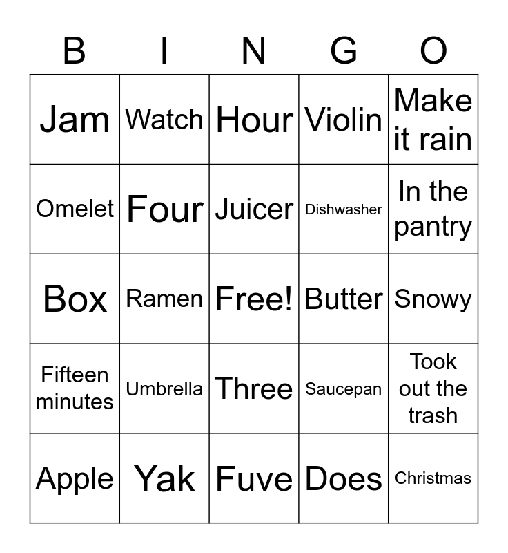 This bingo card has a free space and 29 words: Apple, Away, Ramen, Under the sofa, Jam, Hour, Four, Umbrella, Butter, Yak, Snowy, Christmas, Fuve, Does, In the pantry, December, Three, Fifteen minutes, Make it rain, Box, Saucepan, Coat hangers, Dishwasher, Omelet, Violin, Watch, Took out the trash, Juicer and Eat.