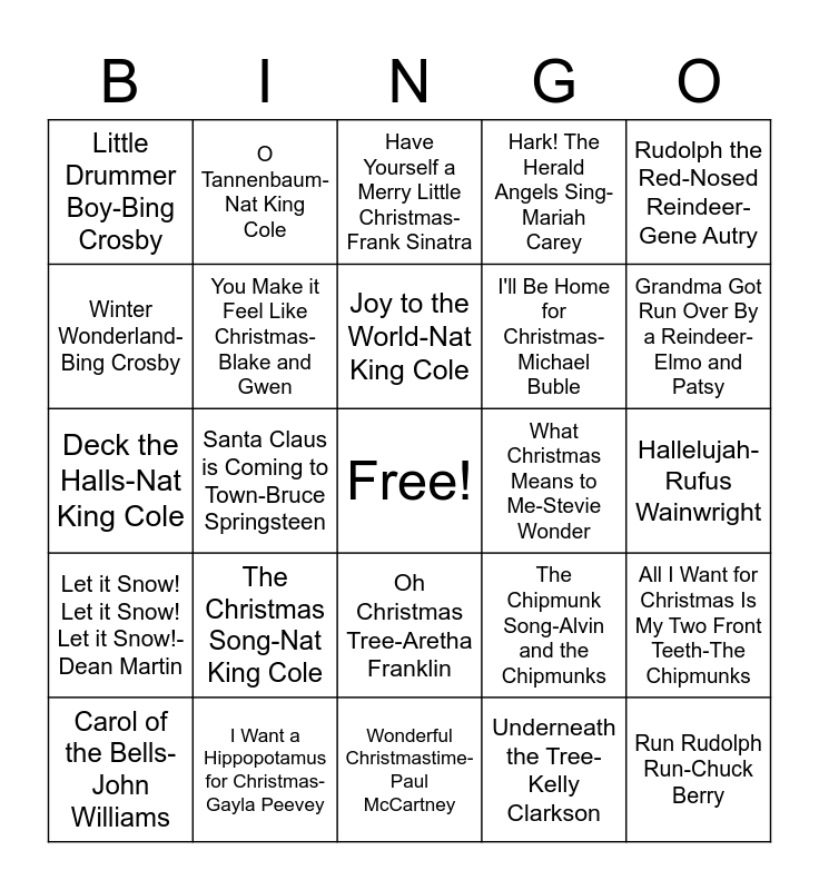 This bingo card has a free space and 60 words: Jingle Bells-Gene Autry, I Want a Hippopotamus for Christmas-Gayla Peevey, The First Noel-Carrie Underwood, Let it Snow! Let it Snow! Let it Snow!-Dean Martin, Underneath the Tree-Kelly Clarkson, Up on the Housetop-Gene Autry, You Make it Feel Like Christmas-Blake and Gwen, Blue Christmas-Elvis Presley, I'll Be Home for Christmas-Michael Buble, Little St. Nick-Beachboys, Hark! The Herald Angels Sing-Mariah Carey, Frosty the Snowman-Jimmy Durant, Winter Wonderland-Bing Crosby, This Christmas-John Legend, (There's No Place) Like Home for the Holidays-Perry Como, Little Drummer Boy-Bing Crosby, Run Rudolph Run-Chuck Berry, Rudolph the Red-Nosed Reindeer-Gene Autry, Christmas in Hollis-Run DMC, Joy to the World-Nat King Cole, What Christmas Means to Me-Stevie Wonder, Have Yourself a Merry Little Christmas-Frank Sinatra, Carol of the Bells-John Williams, All I Want for Christmas Is My Two Front Teeth-The Chipmunks, Jingle Bell Rock-Bobby Helms, Happy Holiday-Andy Williams, Happy X-mas-John and Yoko, White Christmas-Bing Crosby, Grandma Got Run Over By a Reindeer-Elmo and Patsy, O Holy Night-Mariah Carey, Where Are You Christmas-Faith Hill, I Saw Mommy Kissing Santa Claus-Jackson 5, Linus and Lucy-Vince Guaraldi Trio, Rockin' Around the Christmas Tree-Brenda Lee, O Tannenbaum-Nat King Cole, All I Want for Christmas Is You-Mariah Carey, Feliz Navidad-Jose Feliciano, Santa Claus is Coming to Town-Bruce Springsteen, Please Come Home for Christmas-Eagles, Deck the Halls-Nat King Cole, Sleigh Ride-The Ronettes, The Christmas Song-Nat King Cole, Hallelujah-Rufus Wainwright, A Holly Jolly Christmas-Burl Ives, The Chipmunk Song-Alvin and the Chipmunks, 12 Days of Christmas-Straight No Chaser, Do You Hear What I Hear-Whitney Houston, Silent Night-Frank Sinatra, You're a Mean One, Mr. Grinch-Thurl Ravenscroft, Oh Christmas Tree-Aretha Franklin, Wonderful Christmastime-Paul McCartney, Here Comes Santa Claus-Elvis, Baby It's Cold Outside-Frank Sinatra and Dorothy Kirsten, God Rest Ye Merry Gentlemen-Nat King Cole, Santa Baby-Madonna, Male Kalikimake(Merry Christmas)-Bing Crosby, It's Beginning to Look a Lot Like Christmas-Perry Como and The Fontane Sisters, Last Christmas-Wham, It's the Most Wonderful Time of the Year-Andy Williams and O Come All Ye Faithful-Katharine McPhee.