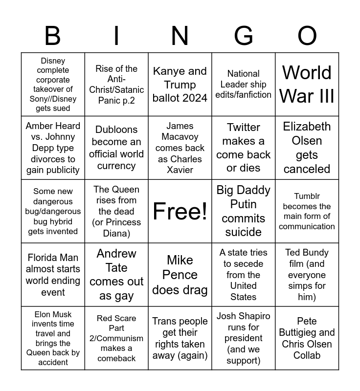 This bingo card has a free space and 24 words: Andrew Tate comes out as gay, Red Scare Part 2/Communism makes a comeback, James Macavoy comes back as Charles Xavier, Elon Musk invents time travel and brings the Queen back by accident, World War III, Disney complete corporate takeover of Sony//Disney gets sued, Amber Heard vs. Johnny Depp type divorces to gain publicity, Rise of the Anti-Christ/Satanic Panic p.2, Big Daddy Putin commits suicide, Mike Pence does drag, Twitter makes a come back or dies, Some new dangerous bug/dangerous bug hybrid gets invented, A state tries to secede from the United States, Ted Bundy film (and everyone simps for him), Dubloons become an official world currency, Josh Shapiro runs for president (and we support), Tumblr becomes the main form of communication, Kanye and Trump ballot 2024, Elizabeth Olsen gets canceled, The Queen rises from the dead (or Princess Diana), Pete Buttigieg and Chris Olsen Collab, Florida Man almost starts world ending event, National Leader ship edits/fanfiction and Trans people get their rights taken away (again).