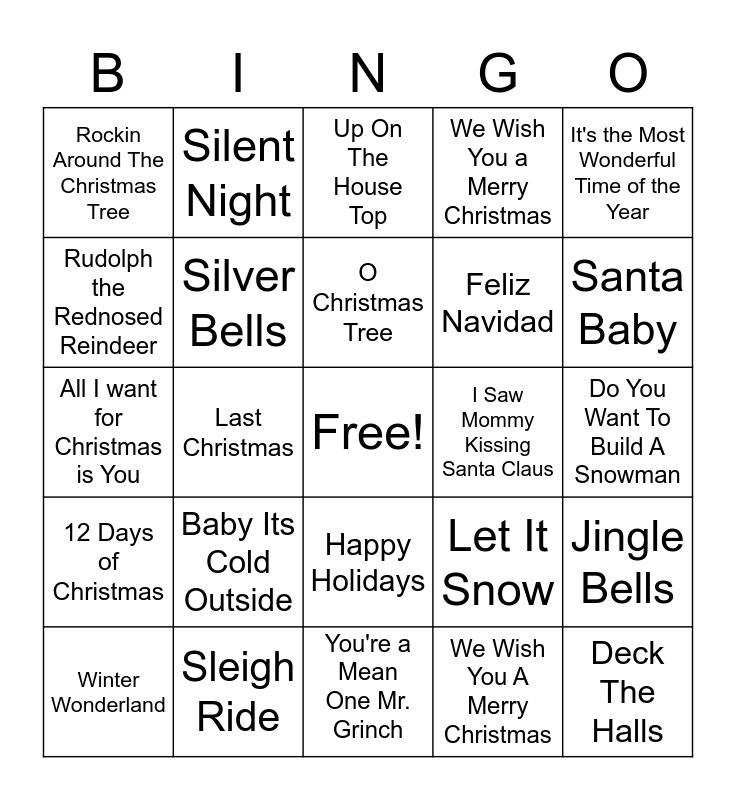This bingo card has a free space and 31 words: You're a Mean One Mr. Grinch, Jingle Bell Rock, Last Christmas, Frosty The Snowman, Rockin Around The Christmas Tree, Up On The House Top, Silver Bells, Let It Snow, I Saw Mommy Kissing Santa Claus, We Wish You A Merry Christmas, Do You Want To Build A Snowman, Deck The Halls, A Holly Jolly Christmas, White Christmas, Santa Baby, Its Beginning To Look a Lot Like Christmas, Jingle Bells, Baby Its Cold Outside, 12 Days of Christmas, Happy Holidays, It's the Most Wonderful Time of the Year, Mele Kalikimaka, Winter Wonderland, Silent Night, Feliz Navidad, Rudolph the Rednosed Reindeer, We Wish You a Merry Christmas, All I want for Christmas is You, Sleigh Ride, O Christmas Tree and Blue Christmas.