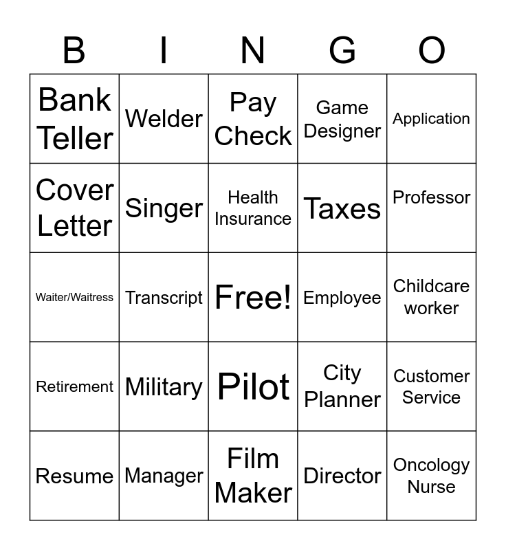 This bingo card has a free space and 39 words: Baker, Electrician, Employer, Singer, Resume, Pilot, Health Insurance, Tour Guide, Application, Retirement, Transcript, Game Designer, Oncology Nurse, Childcare worker, Employee, Military, Hotel Manager, Bank Teller, Social Security, City Planner, Cover Letter, Film Maker, Taxes, Professor, Benefits, Song Writer, Special Ed. Teacher, Audiologist, Paralegal, Welder, Flight Attendant, Illustrator, Pay Check, Manager, Director, Benefits Clerk, Customer Service, Waiter/Waitress and Yoga Instructor.
