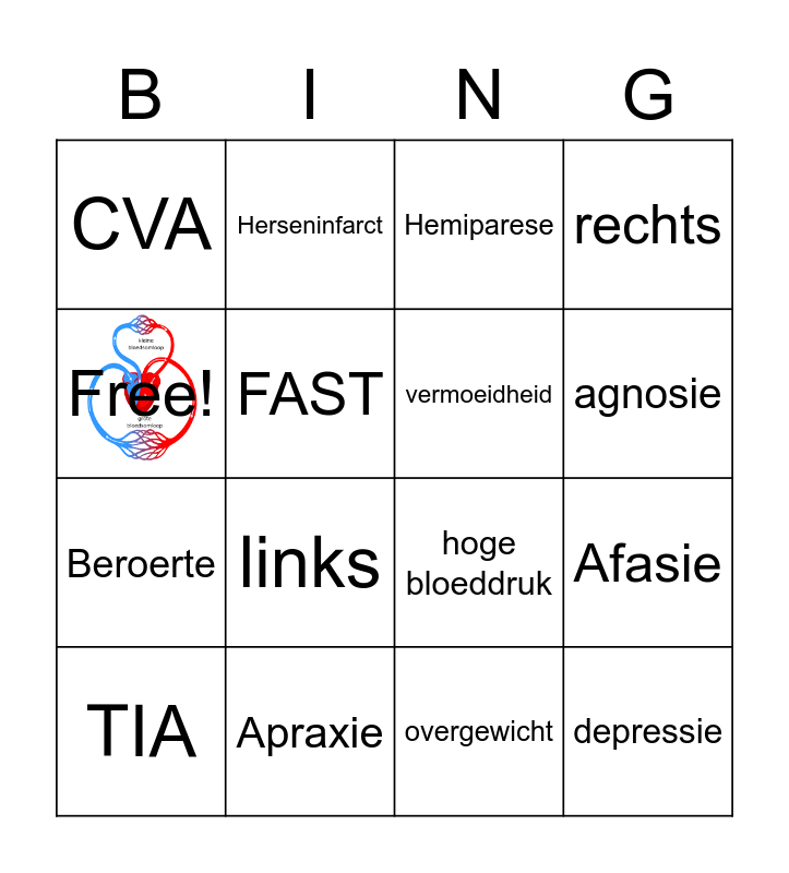 This bingo card has 1 images and 16 words: Apraxie, Afasie, Hemiparese, CVA, Beroerte, Herseninfarct, hoge bloeddruk, overgewicht, Free!, FAST, TIA, rechts, links, agnosie, vermoeidheid and depressie.