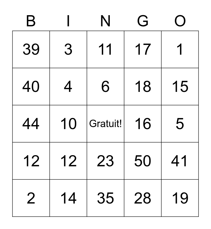 This bingo card has a free space and 24 words: 12, 14, 6, 2, 1, 39, 40, 3, 16, 23, 18, 44, 50, 41, 4, 28, 5, 11, 15, 10, 19, 12, 17 and 35.