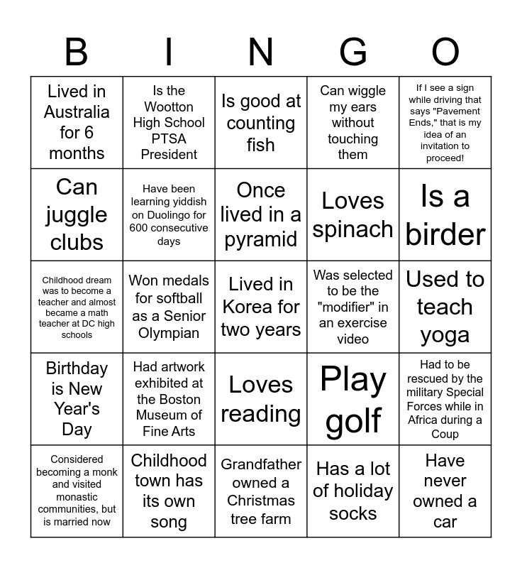 This bingo card has 77 words: Enjoys crafts, Used to be in a rock band, Is good at counting fish, Played one season of tackle football, Won the middle school geography bee, Went on a safari, Played clarinet and bass clarinet for six years, Childhood nickname was Angelina Ballerina, Will be featured in a painting at a John Chumley art show in January at the Museum of the Shenandoah Valley, Was born in December in a snow storm, Have never owned a car, Runs science fiction conventions and contests, Once lived in a pyramid, Can juggle clubs, Play the clarinet, Won medals for softball as a Senior Olympian, Loves interior decorating, Lived in Korea for two years, Cannot ride a bike or skate, If I see a sign while driving that says "Pavement Ends," that is my idea of an invitation to proceed!, Used to play clarinet, saxophone, and piano, Childhood dream was to become a teacher and almost became a math teacher at DC high schools, Have been learning yiddish on Duolingo for 600 consecutive days, Is the Wootton High School PTSA President, Can wiggle my ears without touching them, Participated in marching band, Quoted in Cosmo Magazine, Top 0.05% of Beyonce listners on Spotify in 2022, Majored in Math, Has a birthmark on their retina, Worked as a background actor and dancer in movies, Has seven chickens, Wanted to be a cowgirl and had a horse for 23 years, Play golf, Is a birder, Loves spinach, Former middle school math teacher, Has a twin, Used to teach yoga, Has a lot of holiday socks, Hosted an interview for a documentary of a rapper at their house, Has two dogs and volunteers with Lab Rescue, Photographed wedding and maternity shoots, Met Muhammad Ali in the late 90s, Has been in the Indian Ocean more than the Atlantic Ocean, Favorite sport is volleyball, Considered becoming a monk and visited monastic communities, but is married now, Lived in Australia for 6 months, Was left behind in the Battle Field in Iraq and walked 3-4 miles alone in the dark to catch up with the team, Lived in seven states and Washington, D.C., Like playing video games, Loves reading, Favorite food is hearty soup, Volunteer at the National Gallery of Art, Have run 10 marathons, Ran over 1,500 miles last year, Lost a car on the Price is Right, Former roller speed skater, Loves people, Used to weigh 400 lbs, Had artwork exhibited at the Boston Museum of Fine Arts, Dog lover, Loves anime, Makes handmade soap, Visited the Galapagos Island, Is an introvert, Ran the Marine Marathon in 2000, Was selected to be the "modifier" in an exercise video, Is shy and funny, Was on the gameshow Let's Make a Deal, Loves to sail, Had to be rescued by the military Special Forces while in Africa during a Coup, Birthday is New Year's Day, Childhood town has its own song, First job was at a camera store, Grandfather owned a Christmas tree farm and Is a regular platelet donor.