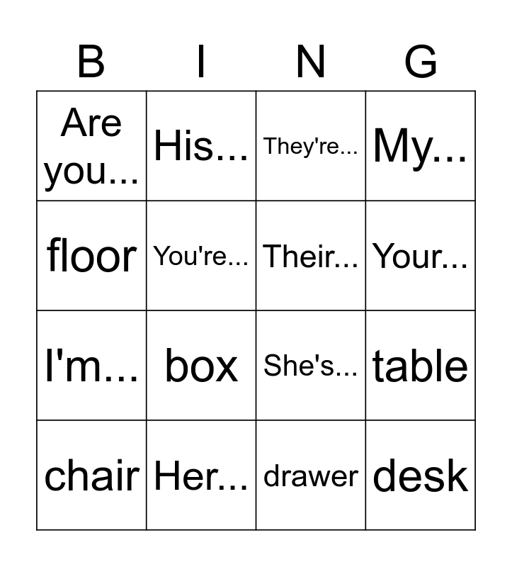 This bingo card has 17 words: drawer, chair, They're..., Are you..., box, My..., table, Their..., Your..., You're..., Her..., She's..., floor, His..., I'm..., He's... and desk.