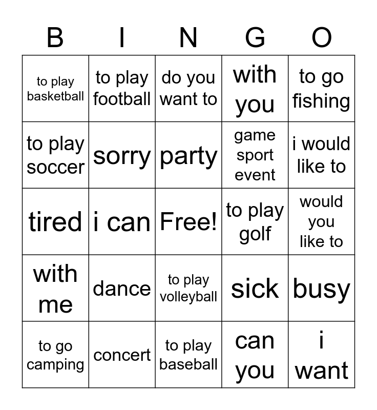 This bingo card has a free space and 24 words: dance, concert, party, to go camping, to go fishing, to play basketball, to play soccer, to play football, to play golf, to play volleyball, game sport event, tired, sick, busy, sorry, can you, would you like to, do you want to, i would like to, i can, i want, with me, with you and to play baseball.