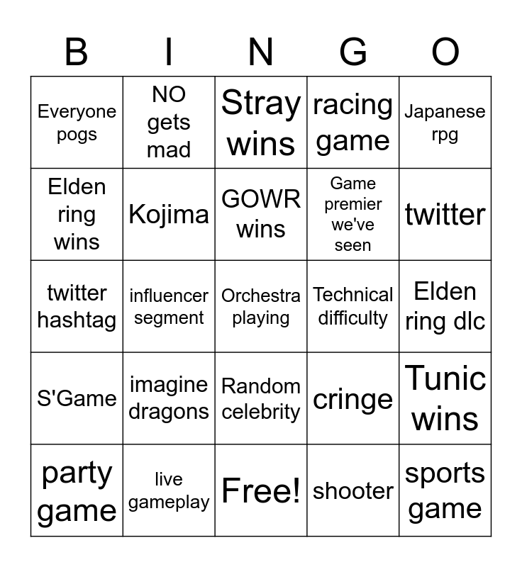 This bingo card has 25 words: S'Game, live gameplay, Orchestra playing, shooter, Japanese rpg, Everyone pogs, NO gets mad, Stray wins, Technical difficulty, Tunic wins, Elden ring wins, Kojima, Free!, cringe, twitter, party game, influencer segment, GOWR wins, Game premier we've seen, Elden ring dlc, twitter hashtag, imagine dragons, Random celebrity, racing game and sports game.