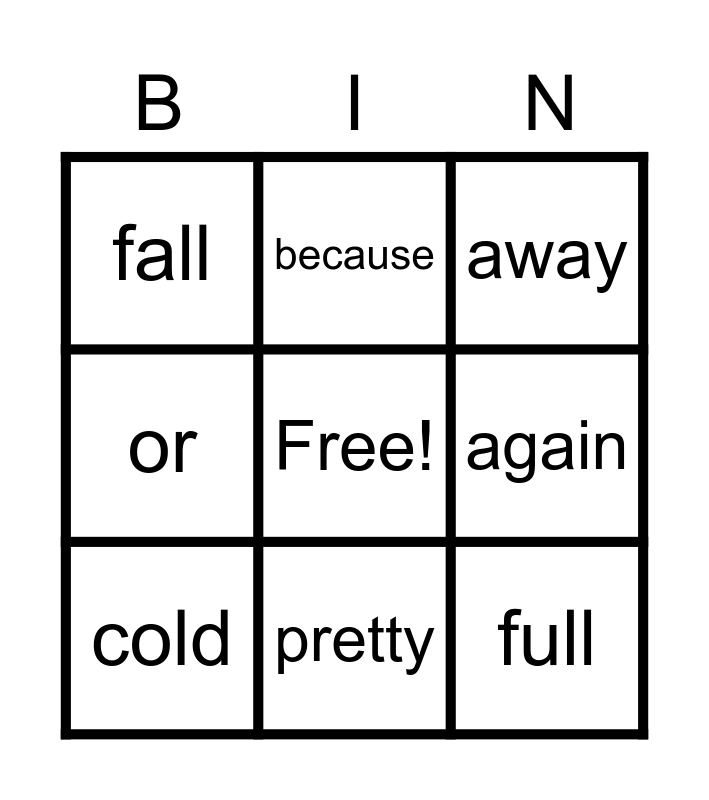 This bingo card has a free space and 8 words: again, away, because, cold, fall, full, or and pretty.
