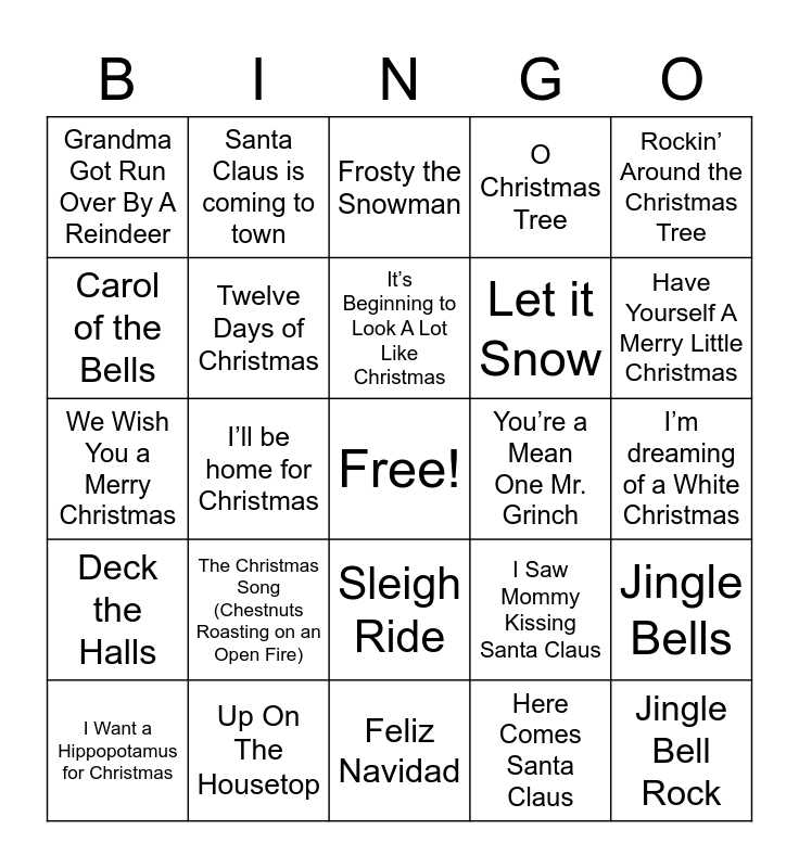 This bingo card has a free space and 28 words: Jingle Bells, Rudolph the Red Nosed Reindeer, Let it Snow, Here Comes Santa Claus, Carol of the Bells, Frosty the Snowman, Santa Claus is coming to town, Deck the Halls, You’re a Mean One Mr. Grinch, I Want a Hippopotamus for Christmas, We Wish You a Merry Christmas, O Christmas Tree, Up On The Housetop, Feliz Navidad, Have Yourself A Merry Little Christmas, Winter Wonderland, The Christmas Song (Chestnuts Roasting on an Open Fire), Twelve Days of Christmas, It’s Beginning to Look A Lot Like Christmas, Sleigh Ride, Grandma Got Run Over By A Reindeer, Have A Holly Jolly Christmas, Jingle Bell Rock, I’ll be home for Christmas, I’m dreaming of a White Christmas, I Saw Mommy Kissing Santa Claus, Rockin’ Around the Christmas Tree and All I Want for Christmas is my 2 Front Teeth.
