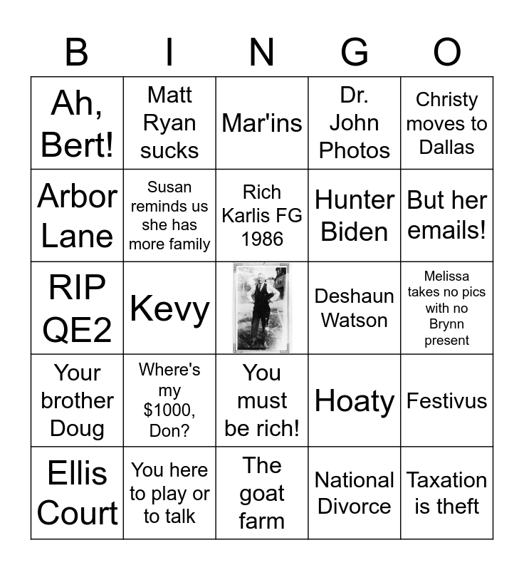 This bingo card has a free space and 24 words: Where's my $1000, Don?, You here to play or to talk, Rich Karlis FG 1986, Ellis Court, Christy moves to Dallas, Ah, Bert!, Arbor Lane, Matt Ryan sucks, Deshaun Watson, You must be rich!, Hunter Biden, RIP QE2, Hoaty, Festivus, Susan reminds us she has more family, National Divorce, Melissa takes no pics with no Brynn present, Mar'ins, But her emails!, Kevy, Taxation is theft, Your brother Doug, Dr. John Photos and The goat farm.