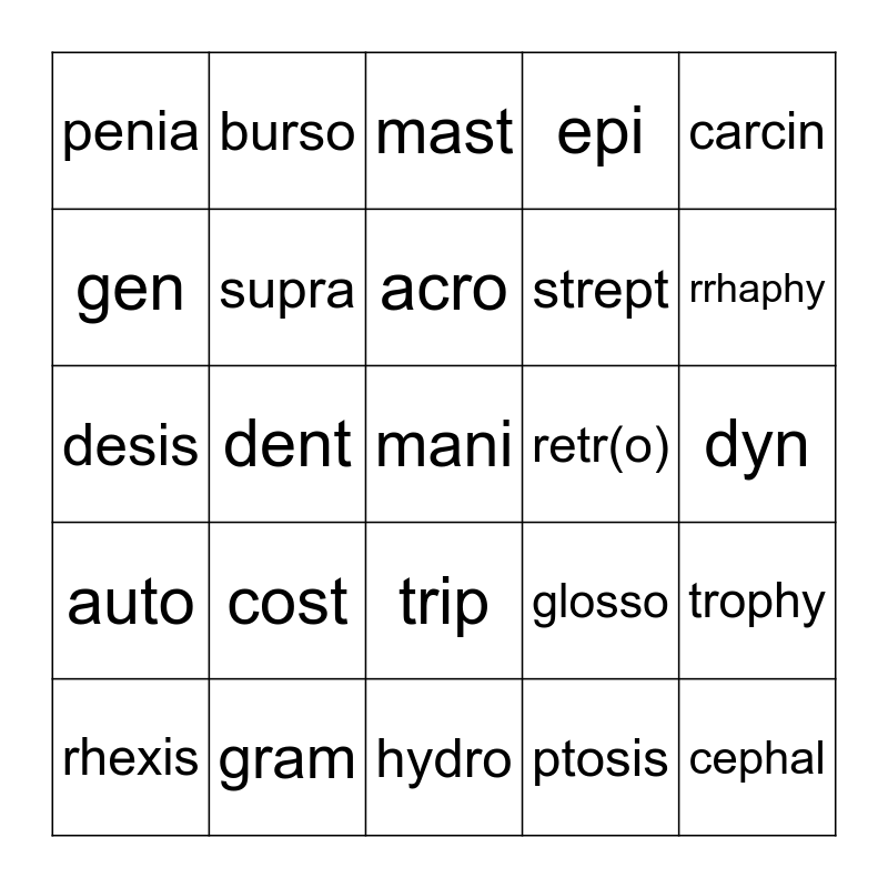 This bingo card has a free space and 24 words: cost, gram, acro, rhexis, carcin, penia, gen, burso, retr(o), trip, strept, desis, glosso, trophy, supra, ptosis, dyn, mast, rrhaphy, dent, cephal, auto, epi and hydro.