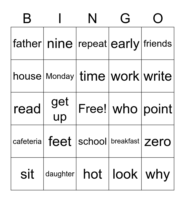 This bingo card has a free space and 29 words: sit, stomach, get up, early, father, repeat, Monday, feet, who, daughter, point, why, hot, look, write, ears, school, cafeteria, friends, read, breakfast, cold, work, house, early, nine, zero, time and you.