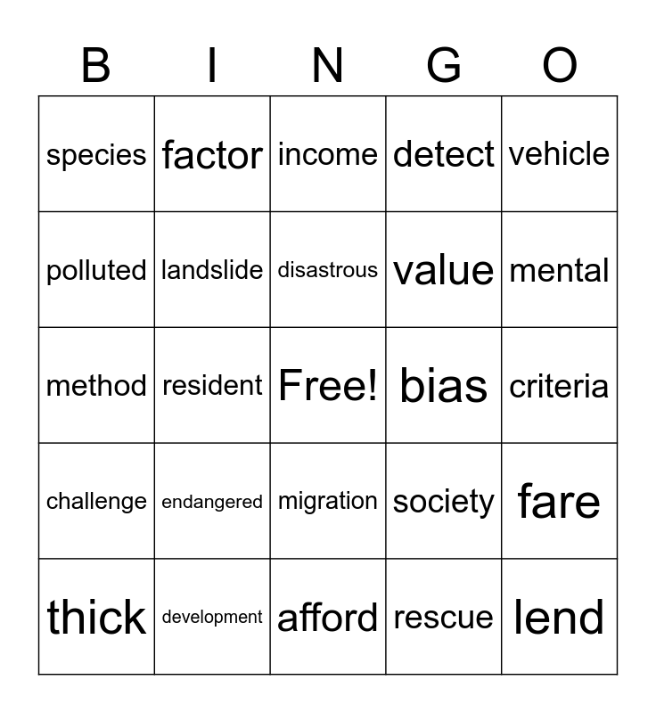 This bingo card has a free space and 24 words: endangered, development, disastrous, thick, vehicle, species, polluted, factor, bias, migration, value, method, society, fare, landslide, rescue, criteria, income, mental, resident, lend, challenge, detect and afford.