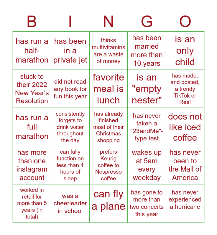 This bingo card has 50 words: is scuba certified, has already finished most of their Christmas shopping, doesn't know how to say "art basel", can fly a plane, can fully function on less than 4 hours of sleep, likes to binge watch a whole series in one sitting, has been in a private jet, currently has a pet other than a dog or cat, stuck to their 2022 New Year's Resolution, owns, and uses, a "Snuggie", did not read any book for fun this year, has been married more than 10 years, has never been to the Mall of America, wakes up at 5am every weekday, would rather eat takeout at home than go out to dinner, does not have any social media (other than LinkedIn), favorite meal is lunch, has never taken a "23andMe"-type test, doesn't like the movie "Forrest Gump", is an only child, consistently forgets to drink water throughout the day, has gone to more than two concerts this year, has run a half-marathon, is an "empty nester", prefers malls to shopping online, has never experienced a hurricane, has made, and posted, a trendy TikTok or Reel, has never been to another continent, thinks multivitamins are a waste of money, prefers Keurig coffee to Nespresso coffee, actually likes daylight savings time, was a theater kid in school, played football in school, played in the marching band in school, was a cheerleader in school, doesn't understand a lot of popular memes, exclusively watches reality tv, could not name all of the Kardashian / Jenner sisters, thinks tea is superior to coffee, does not like iced coffee, has solo traveled to another country, loves the store "Dollar Tree", doesn't like Star Trek or Star Wars, prefers spin classes to lifting weights, worked in retail for more than 5 years (in total), has run a full marathon, will not start Christmas shopping until the week-of, cannot name more than 20 presidents, has more than one instagram account and struggles with severe road rage.