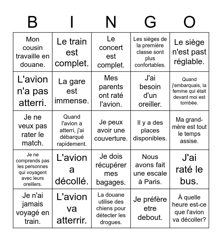 This bingo card has a free space and 24 words: L'avion a décollé., L'avion va atterrir., Mes parents ont raté l'avion., Je n'ai jamais voyagé en train., Le siège n'est past réglable., Mon cousin travaille en douane., L'avion n'a pas atterri., Le train est complet., Il y a des places disponibles., Je dois récupérer mes bagages., J'ai besoin d'un oreiller., Je ne veux pas rater le match., Nous avons fait une escale à Paris., J'ai raté le bus., La gare est immense., Je préfère etre debout., Ma grand-mère est tout le temps assise., Le concert est complet., Quand j'embarquais, la femme qui était devant moi est tombée., Quand l'avion a atterri, j'ai débarqué rapidement., À quelle heure est-ce que l'avion va décoller?, Je ne comprends pas les personnes qui voyagent avec leurs oreillers., Les sièges de la première classe sont plus confortables. and La douane utilise des chiens pour détecter les drogues..