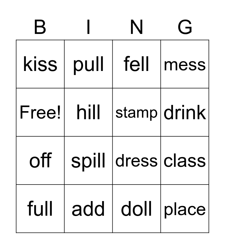 This bingo card has 16 words: add, class, fell, kiss, off, pull, dress, doll, Free!, hill, full, mess, spill, drink, stamp and place.