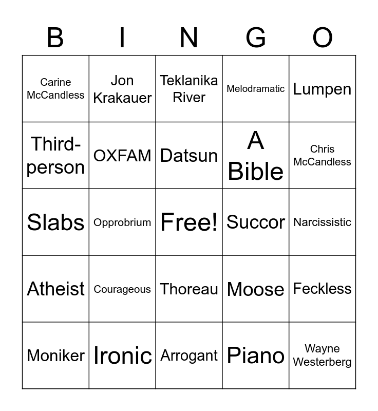 This bingo card has a free space and 35 words: Contumacious, Walt McCandless, Alexander Supertramp, OXFAM, Thoreau, Melodramatic, Third-person, Detrital Wash, Datsun, Onerous, Slabs, Lumpen, Ron Franz, Fulminate, Carine McCandless, Succor, Piano, Opprobrium, Atheist, Wayne Westerberg, Moose, Moniker, Feckless, Ironic, Teklanika River, Chris McCandless, Food, Potato seeds, A Bible, Narcissistic, Noble, Arrogant, Courageous, Jon Krakauer and Alaska.