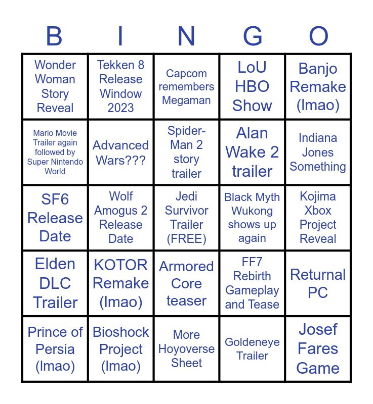 This bingo card has a free space and 24 words: KOTOR Remake (lmao), Bioshock Project (lmao), Spider-Man 2 story trailer, Prince of Persia (lmao), Banjo Remake (lmao), Wonder Woman Story Reveal, Mario Movie Trailer again followed by Super Nintendo World, Tekken 8 Release Window 2023, Black Myth Wukong shows up again, Armored Core teaser, Alan Wake 2 trailer, SF6 Release Date, FF7 Rebirth Gameplay and Tease, Returnal PC, Advanced Wars???, Goldeneye Trailer, Kojima Xbox Project Reveal, Capcom remembers Megaman, Indiana Jones Something, Wolf Amogus 2 Release Date, Josef Fares Game, Elden DLC Trailer, LoU HBO Show and More Hoyoverse Sheet.