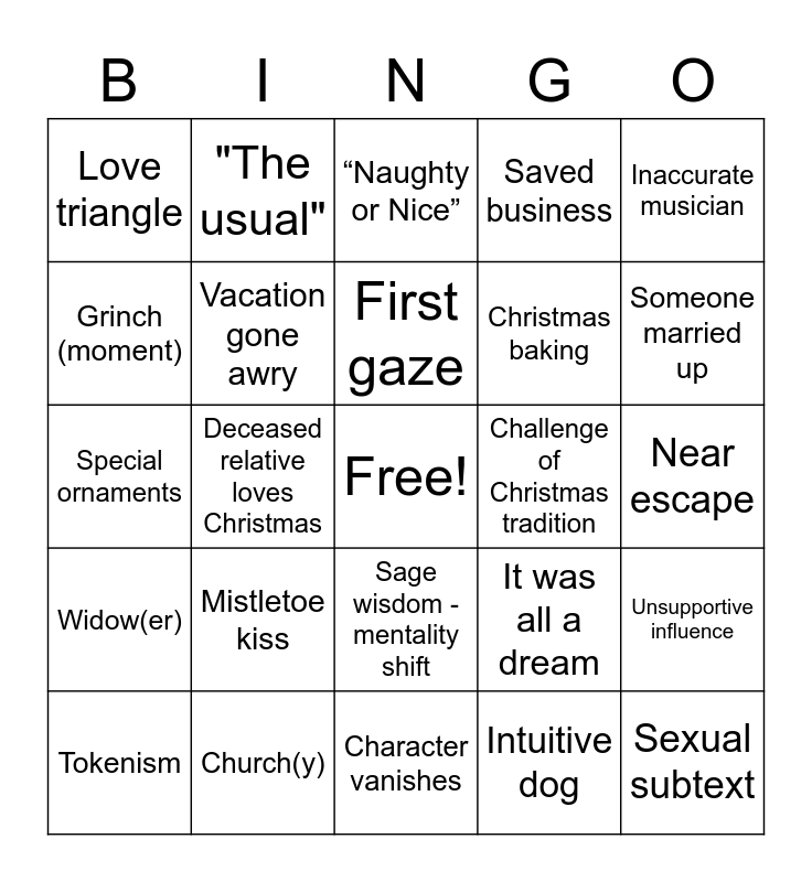 This bingo card has a free space and 63 words: Urban rural divide, Santa nod, Critical misunderstanding, Unsupportive influence, Serendipitous snowfall, Immediate connection, "The usual", A dance, First gaze, Guardian angel, Sage wisdom - mentality shift, Christmas tree shopping, Near escape, Inaccurate musician, School event, Grinch (moment), Deceased relative loves Christmas, Love triangle, Christmas Carols, Christmas baking, Mistletoe kiss, Widow(er), Saved business, Cougar Christmas, Small Christmas town, Living outside their means, Christmas charity, Wish granted, A vision, A Christmas Carol, Blended family, A bad guy, Snowstorm, Unwelcome guest, Someone married up, Tokenism, Homosexual subtext, Intuitive dog, Train moment, Vacation gone awry, Special ornaments, Challenge of Christmas tradition, Secret admirer, Absent dad, Sexual subtext, Church(y), “The end”, It was all a dream, Flashback/forward, Product placement, Woman’s beauty awes man, Character vanishes, Obstinate character reversal, Christmas party, Reindeer, “Naughty or Nice”, Matching Christmas Outfits, Wrapping presents, Decorating a tree, Transportation delay, Marshmallows over open fire, Snowball fight and Ice skating.