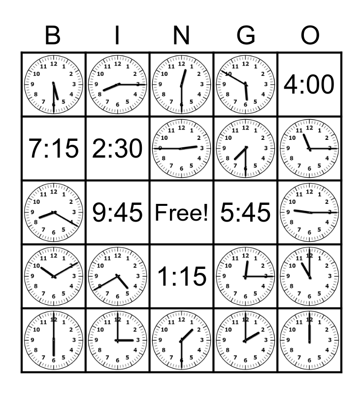 This bingo card has 19 images, a free space and 7 words: 1:15, 4:00, 7:15, 9:45, 5:45, 2:30 and 8:00.