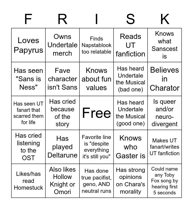 This bingo card has a free space and 24 words: Has played Deltarune, Also likes Hollow Knight or Omori, Knows about fun values, Likes/has read Homestuck, Knows what Sanscest is, Loves Papyrus, Has seen "Sans is Ness", Owns Undertale merch, Has heard Undertale the Musical (good one), Favorite line is "despite everything it's still you", Has heard Undertale the Musical (bad one), Has seen UT fanart that scarred them for life, Knows who Gaster is, Makes UT fanart/writes UT fanfiction, Fave character isn't Sans, Has strong opinions on Chara's morality, Is queer and/or neuro- divergent, Finds Napstablook too relatable, Believes in Charator, Has cried because of the story, Could name any Toby Fox song by hearing first 5 seconds, Has cried listening to the OST, Reads UT fanfiction and Has done true pacifist, geno, AND neutral runs.