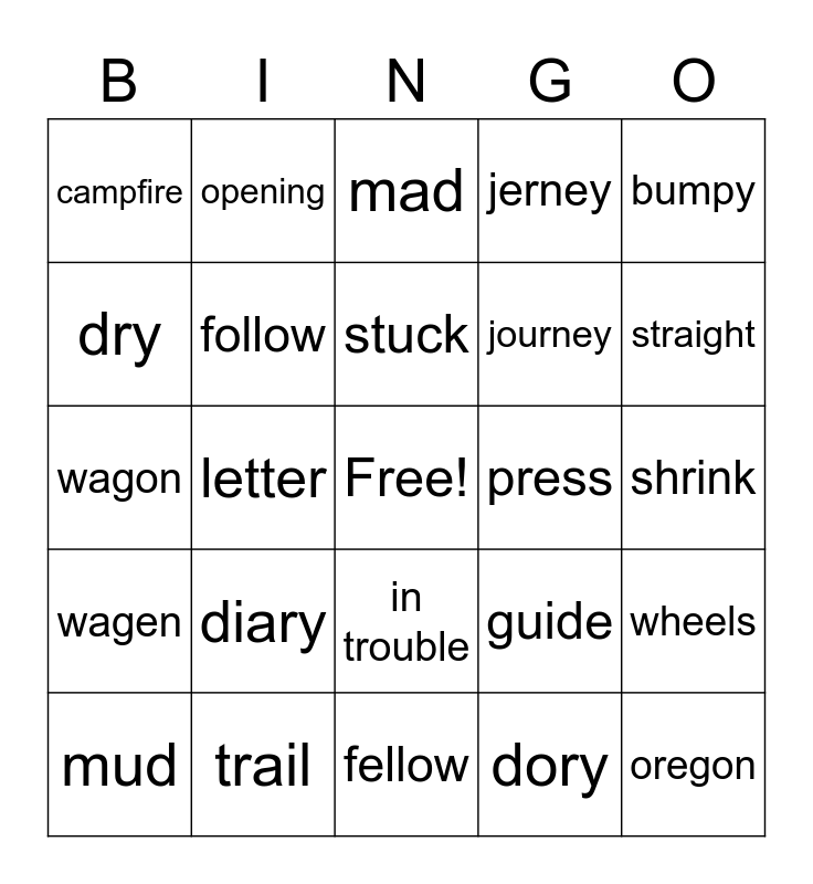 This bingo card has a free space and 24 words: diary, trail, stuck, mud, bumpy, campfire, dry, opening, press, in trouble, journey, wagon, guide, wheels, follow, dory, shrink, mad, straight, letter, oregon, wagen, jerney and fellow.