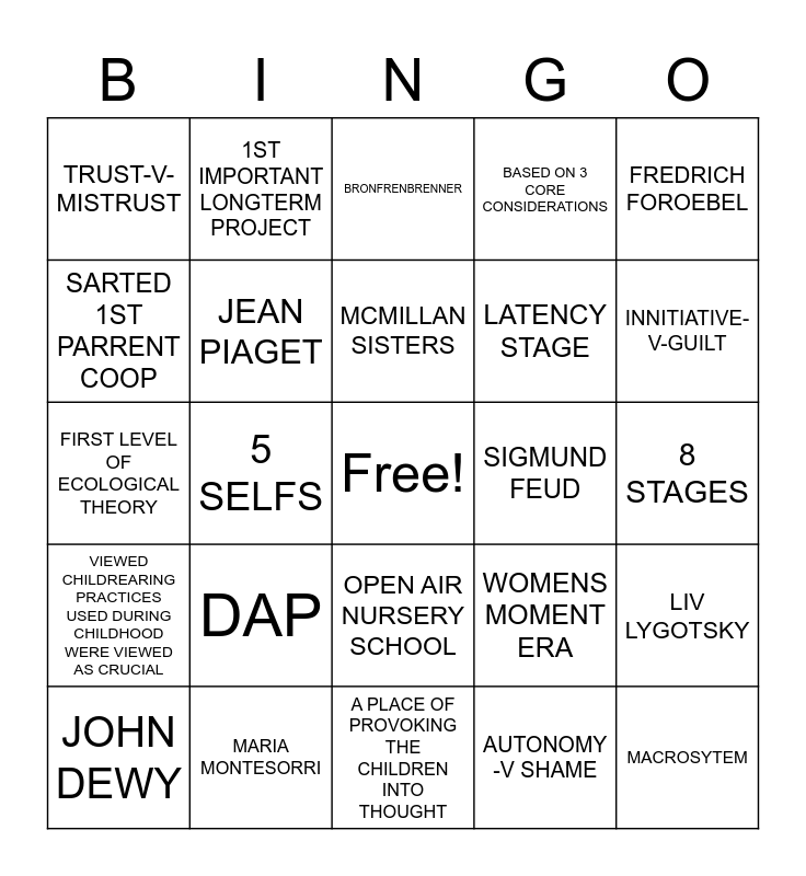 This bingo card has a free space and 24 words: DAP, MARIA MONTESORRI, MCMILLAN SISTERS, JOHN DEWY, FREDRICH FOROEBEL, TRUST-V-MISTRUST, SARTED 1ST PARRENT COOP, 1ST IMPORTANT LONGTERM PROJECT, SIGMUND FEUD, OPEN AIR NURSERY SCHOOL, LATENCY STAGE, FIRST LEVEL OF ECOLOGICAL THEORY, WOMENS MOMENT ERA, LIV LYGOTSKY, JEAN PIAGET, AUTONOMY -V SHAME, 8 STAGES, BRONFRENBRENNER, INNITIATIVE-V-GUILT, 5 SELFS, MACROSYTEM, VIEWED CHILDREARING PRACTICES USED DURING CHILDHOOD WERE VIEWED AS CRUCIAL, BASED ON 3 CORE CONSIDERATIONS and A PLACE OF PROVOKING THE CHILDREN INTO THOUGHT.