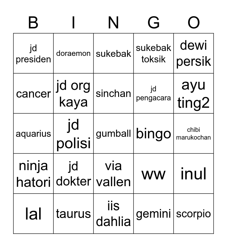This bingo card has a free space and 24 words: jd dokter, taurus, sinchan, lal, dewi persik, jd presiden, cancer, doraemon, bingo, via vallen, jd pengacara, aquarius, ww, inul, jd org kaya, gemini, chibi marukochan, sukebak, ayu ting2, jd polisi, scorpio, ninja hatori, sukebak toksik and iis dahlia.