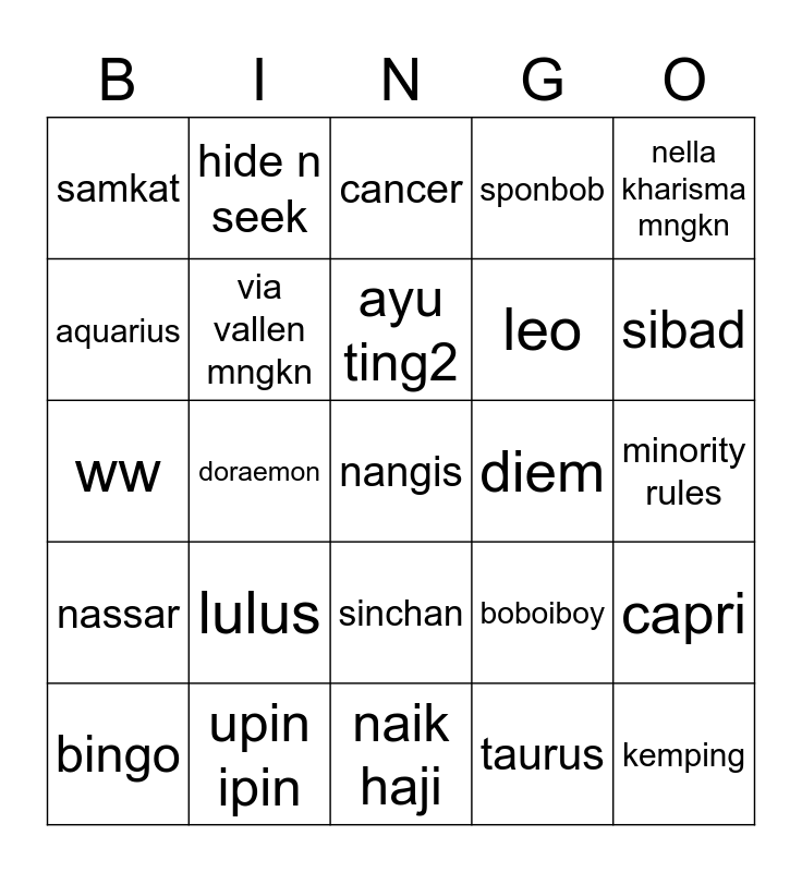 This bingo card has a free space and 24 words: lulus, upin ipin, ayu ting2, bingo, nella kharisma mngkn, samkat, aquarius, hide n seek, diem, sinchan, leo, ww, boboiboy, capri, via vallen mngkn, taurus, minority rules, cancer, sibad, doraemon, kemping, nassar, sponbob and naik haji.