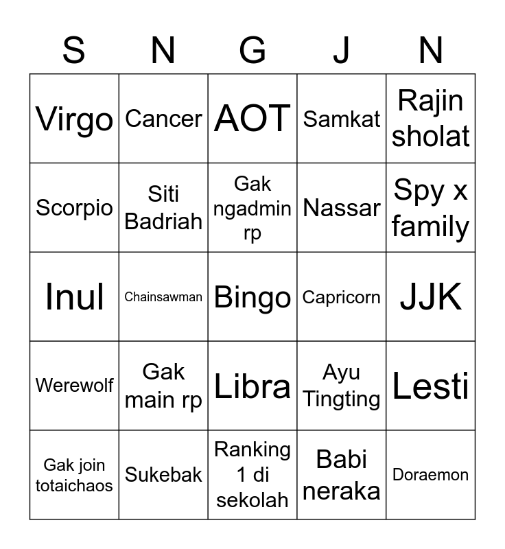 This bingo card has 25 words: Gak main rp, Ranking 1 di sekolah, Gak ngadmin rp, Gak join totaichaos, Rajin sholat, Virgo, Scorpio, Cancer, Capricorn, Libra, Nassar, Inul, Ayu Tingting, Lesti, Siti Badriah, Doraemon, JJK, AOT, Spy x family, Chainsawman, Bingo, Sukebak, Werewolf, Samkat and Babi neraka.