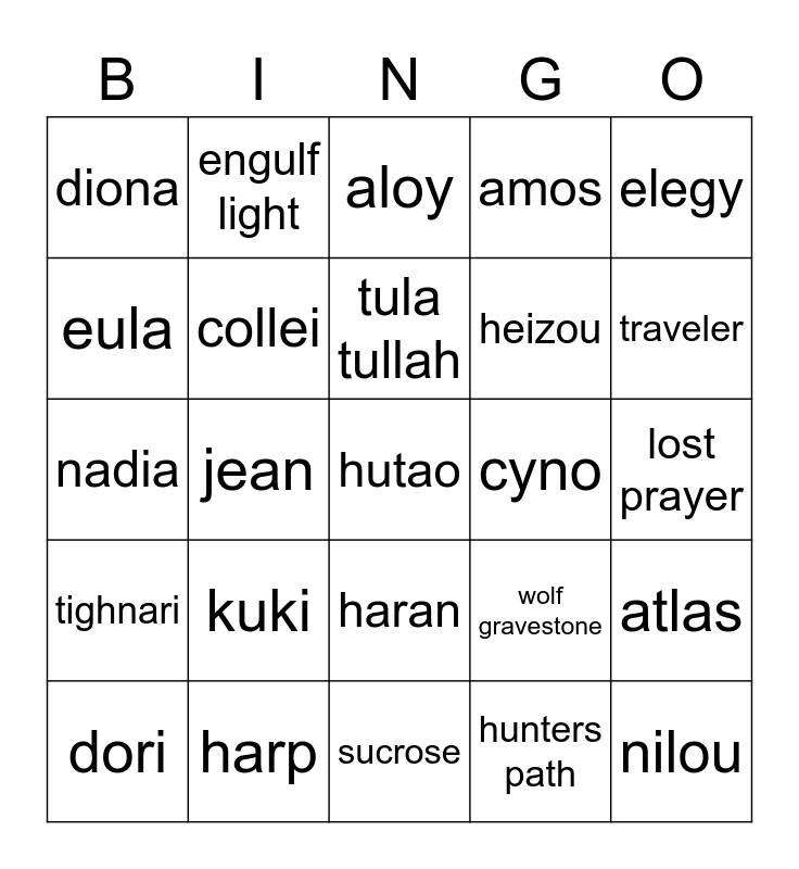 This bingo card has 85 words: layla, albedo, aloy, amber, ayaka, ayato, barbara, beidou, bennett, candace, childe, chongyun, collei, cyno, diluc, diona, dori, eula, fischl, ganyu, gourou, heizou, hutao, itto, jean, kaeya, kazuha, keqing, klee, kokomi, kuki, lisa, mona, nadia, nilou, ningguang, sucrose, thoma, tighnari, traveler, venti, xiangling, xiao, xingqiu, xinyan, yae miko, yanfei, yelan, yunjin, zhongli, engulf light, tula tullah, homa, kagura, mistsplitter, jade spear, harp, amos, floating dreams, aqua, aquila, polar star, jade cutter, calamity, redhorn, elegy, moonglow, atlas, sky blade, sky pride, sky spine, broken pines, SSS, summit shaper, freedom sworn, haran, hunters path, key, unforged, thundering pulse, lost prayer, vortex v, memory of dust, wolf gravestone and scaramouche.