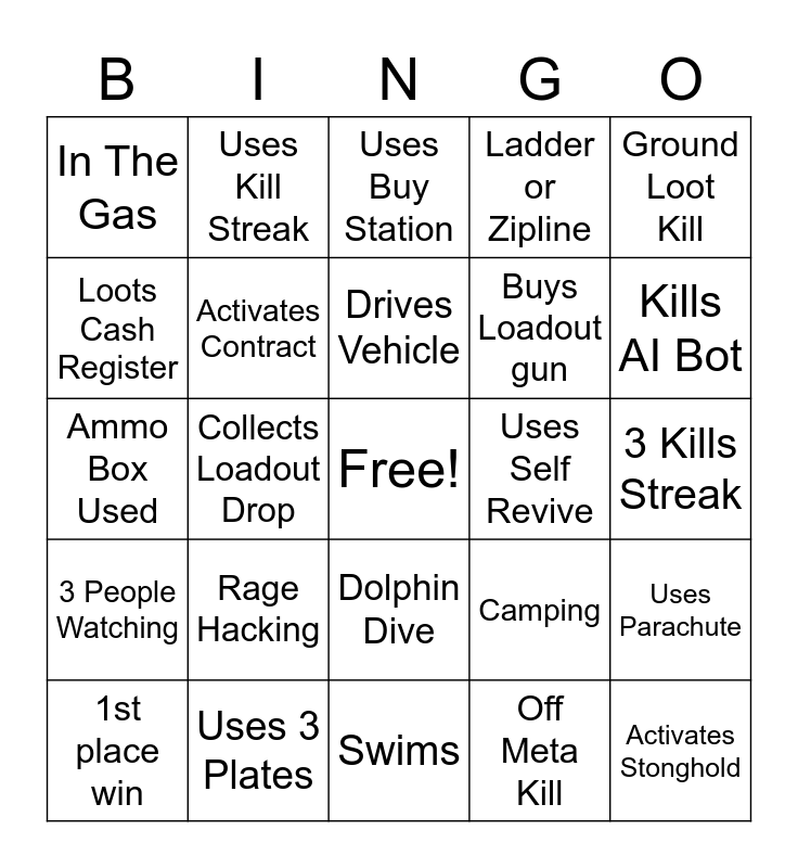 This bingo card has a free space and 25 words: Rage Hacking, Swims, Drives Vehicle, 1st place win, Ground Loot Kill, In The Gas, Loots Cash Register, Uses Kill Streak, Uses Self Revive, Dolphin Dive, Buys Loadout gun, Ammo Box Used, Camping, Uses Parachute, Activates Contract, Opens Closes Door, 3 Kills Streak, Uses Buy Station, Kills AI Bot, Collects Loadout Drop, Activates Stonghold, Uses 3 Plates, 3 People Watching, Ladder or Zipline and Off Meta Kill.