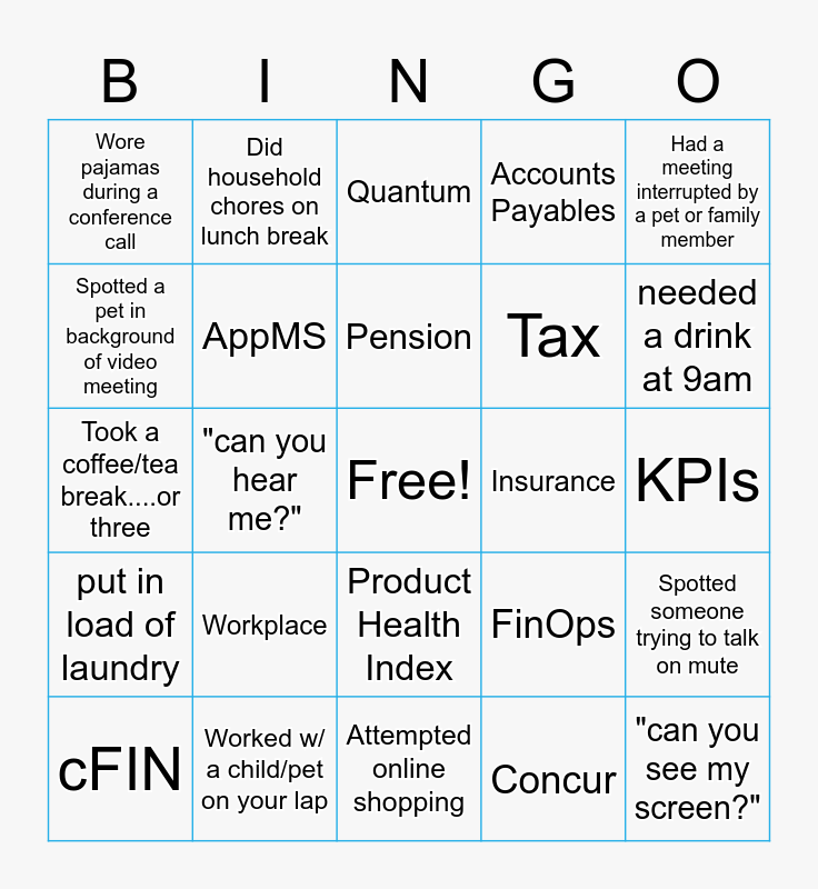 This bingo card has a free space and 24 words: Workplace, Worked w/ a child/pet on your lap, Pension, cFIN, Had a meeting interrupted by a pet or family member, Wore pajamas during a conference call, Spotted a pet in background of video meeting, Did household chores on lunch break, Insurance, Product Health Index, Tax, Took a coffee/tea break....or three, FinOps, Spotted someone trying to talk on mute, AppMS, Concur, KPIs, Quantum, needed a drink at 9am, "can you hear me?", "can you see my screen?", put in load of laundry, Accounts Payables and Attempted online shopping.