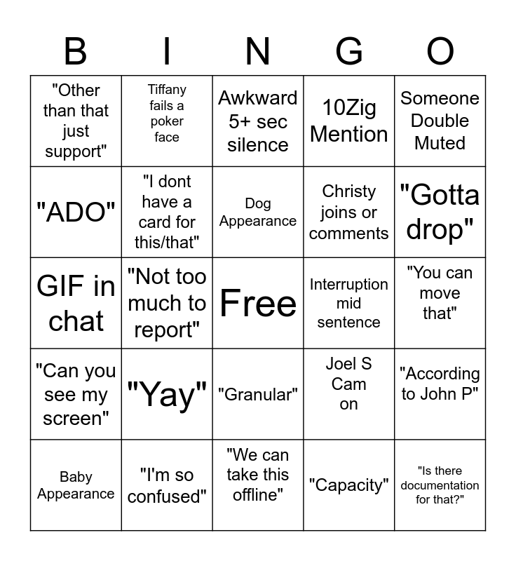 This bingo card has a free space and 24 words: "Yay", "I'm so confused", Dog Appearance, Baby Appearance, Someone Double Muted, "Other than that just support", "ADO", Tiffany fails a poker face, Interruption mid sentence, "Granular", Christy joins or comments, GIF in chat, Joel S Cam on, "According to John P", "I dont have a card for this/that", "Capacity", "You can move that", Awkward 5+ sec silence, "Gotta drop", "Not too much to report", "Is there documentation for that?", "Can you see my screen", 10Zig Mention and "We can take this offline".