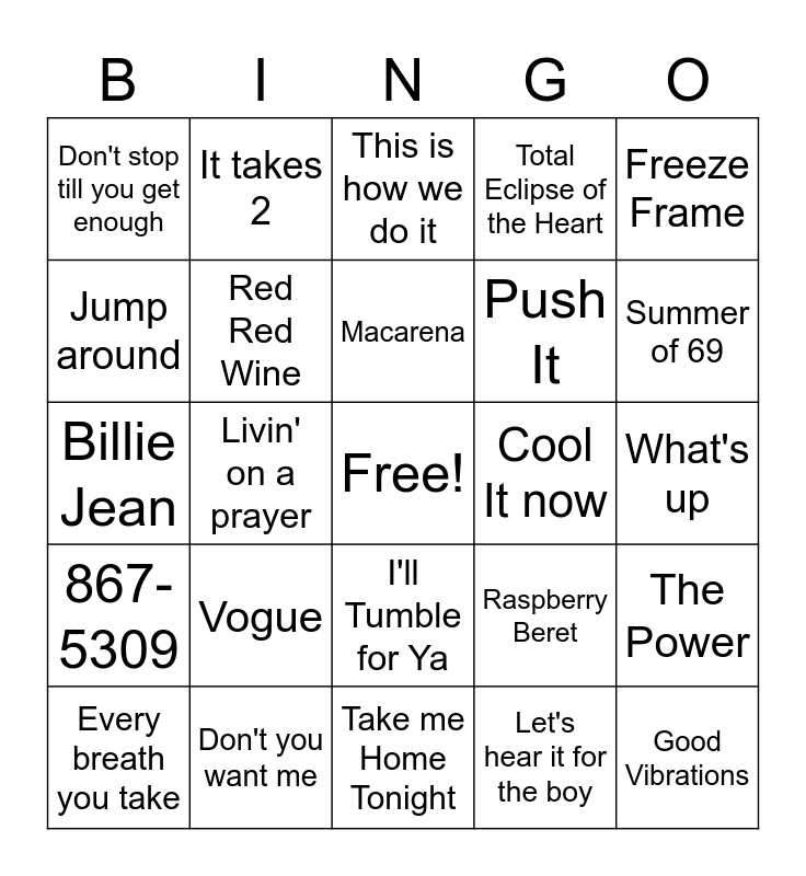 This bingo card has a free space and 24 words: Every breath you take, Vogue, Macarena, Let's hear it for the boy, Freeze Frame, Don't stop till you get enough, It takes 2, This is how we do it, Cool It now, What's up, Billie Jean, Red Red Wine, Raspberry Beret, The Power, Jump around, Don't you want me, Take me Home Tonight, Total Eclipse of the Heart, Summer of 69, 867-5309, Livin' on a prayer, I'll Tumble for Ya, Push It and Good Vibrations.