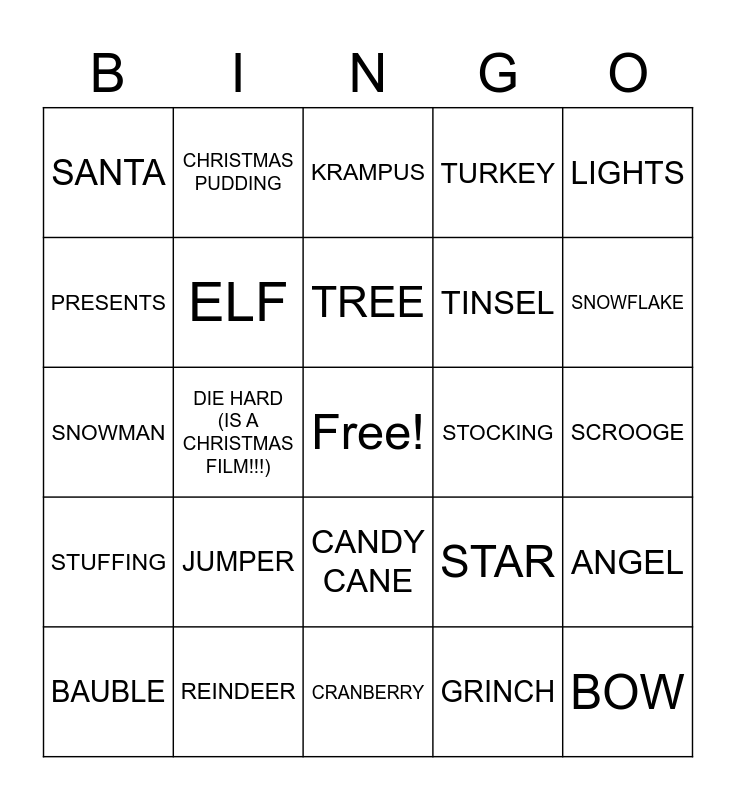 This bingo card has a free space and 24 words: JUMPER, REINDEER, TREE, BAUBLE, LIGHTS, SANTA, PRESENTS, CHRISTMAS PUDDING, STOCKING, CANDY CANE, TINSEL, SNOWMAN, STAR, ANGEL, ELF, GRINCH, SCROOGE, KRAMPUS, SNOWFLAKE, DIE HARD (IS A CHRISTMAS FILM!!!), BOW, STUFFING, TURKEY and CRANBERRY.