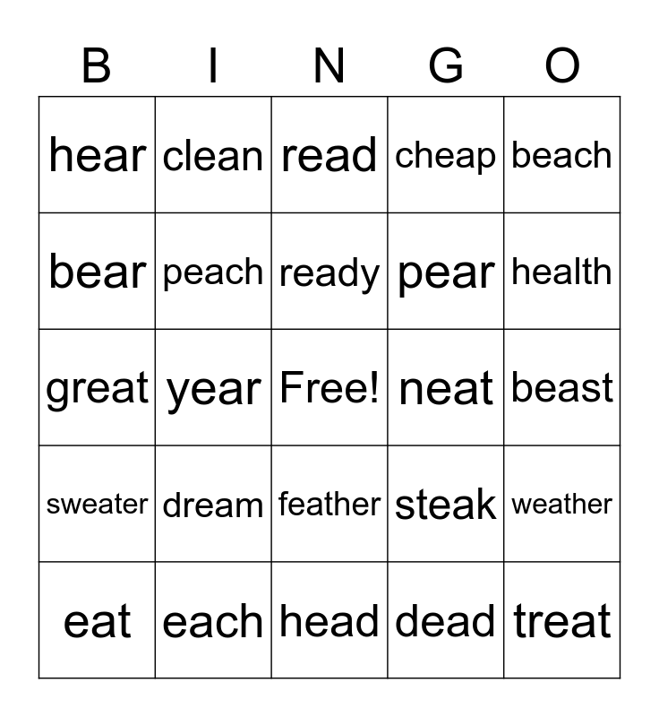 This bingo card has a free space and 29 words: eat, mean, year, seat, hear, read, peach, dream, neat, each, beast, treat, head, dead, health, bread, feather, sweater, beach, great, steak, break, pear, bear, cheap, clean, weather, ready and breakfast.