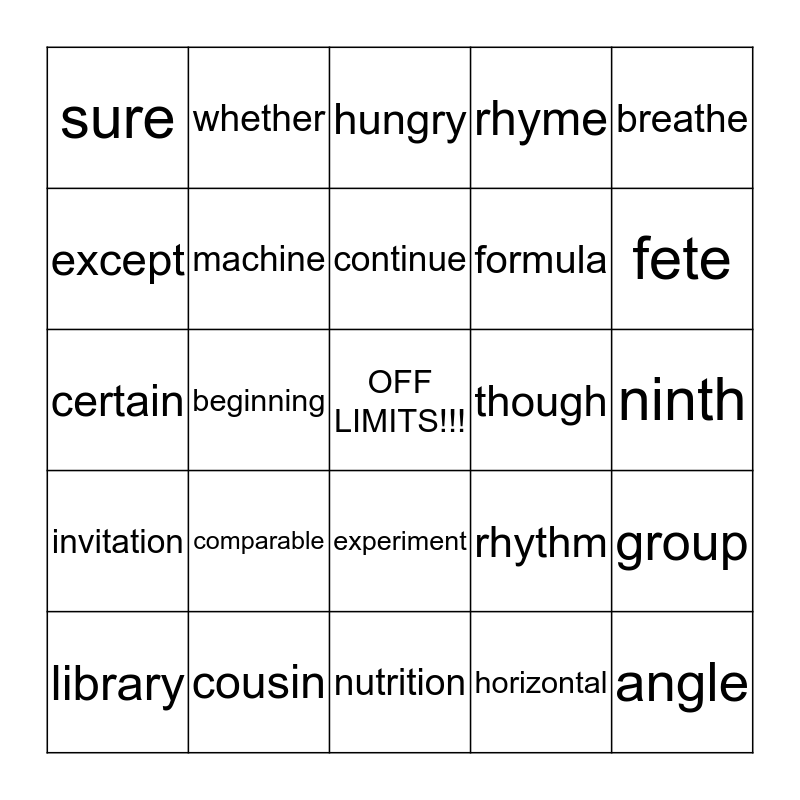 This bingo card has a free space and 138 words: although, column, doesn’t, fifteenth, microphone, though, accept, cooperate, dozen, fulfil, month, through, accurate, comfortable, during, further, ninth, tomorrow, agreeable, community, edible, group, nutrition, trouble, alien, comparable, eighteenth, heard, palm, twentieth, angle, competition, electricity, horizontal, past, thousand, angel, conference, government, hundredth, percentage, truly, answer, concave, enough, hungry, perhaps, type, appear, convex, entry, invitation, picture, uncle, aquarium, continue, equivalent, immediately, question, vary, audible, cousin, escape, interest, quite, wander, aunt, convenient, except, instead, quality, wary, available, cover, exclamation, journey, receive, watch, beginning, craft, exit, journal, remember, whether, behaviour, daughter, expect, knowledge, rhythm, wild, between, deceive, expedition, library, rhyme, wonder, break, deny, experiment, litre, rinse, world, breathe, describe, extraordinary, location, scissors, worry, byte, decade, favourite, machine, seldom, worst, centre, decision, fete, meanwhile, search, central, diameter, field, metre, stomach, certain, difficult, formula, measurement, straight, character, direction, fourth, mechanic, sure, chemical, disappear, fourteenth and microscope.