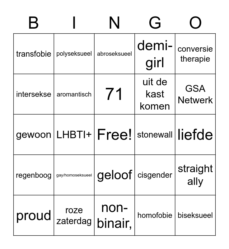 This bingo card has a free space and 52 words: transgender, biseksueel, panseksueel, non-binair,, gay/homoseksueel, lesbisch, polyseksueel, aseksueel, intersekse, genderqueer, aromantisch, hetroseksueel, straight ally, cisgender, genderfluïde, gelijkheid, 71, stonewall, 2 april 2001, conversie therapie, LHBTI+, homofobie, transfobie, uit de kast komen, paarse vrijdag, Coming out day, pride month, COC Nederland, GSA Netwerk, queer, demi-boy, demi-girl, bigender, demiseksueel, demiromantisch, abroseksueel, roze zaterdag, voornaamwoorden, genderstudies, jezelf zijn, vooroordelen, liefde, regenboog, WK-protesten, geloof, voortlichtingen, Inclusiefiteit, gewoon, mentale klachten, acceptatie, proud and regenboogzebrapad.