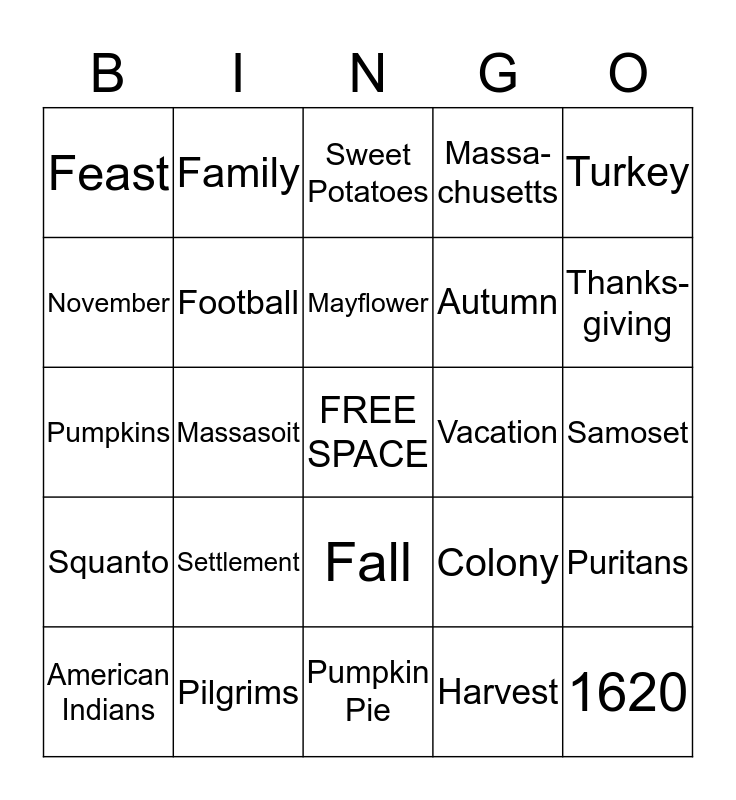 This bingo card has a free space and 24 words: Settlement, Pilgrims, Mayflower, American Indians, Turkey, Feast, November, Family, Vacation, Fall, Autumn, Pumpkins, Colony, Puritans, Football, Harvest, Samoset, Sweet Potatoes, Thanks-giving, Massasoit, 1620, Squanto, Massa-chusetts and Pumpkin Pie.