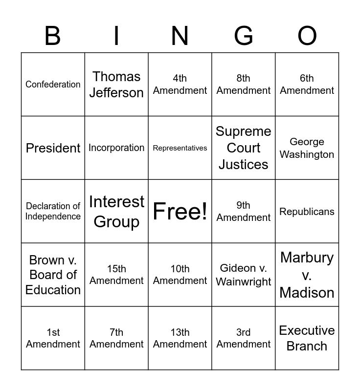 This bingo card has a free space and 44 words: Legislative Branch, Executive Branch, Judicial Branch, 1st Amendment, 2nd Amendment, 3rd Amendment, 4th Amendment, 5th Amendment, 6th Amendment, 7th Amendment, 8th Amendment, 9th Amendment, 10th Amendment, 15th Amendment, 19th Amendment, 13th Amendment, 14th amendment, Declaration of Independence, Federalist Papers, George Washington, Thomas Jefferson, Federalism, Dictatorship, Confederation, Democrats, Republicans, Separation of Powers, Checks and Balances, Gideon v. Wainwright, Brown v. Board of Education, McCulloch v. Maryland, Marbury v. Madison, Suffrage, Political Party, Interest Group, Electoral College, Primary Elections, Senators, Representatives, President, Supreme Court Justices, General Election, Incorporation and The Constitution.