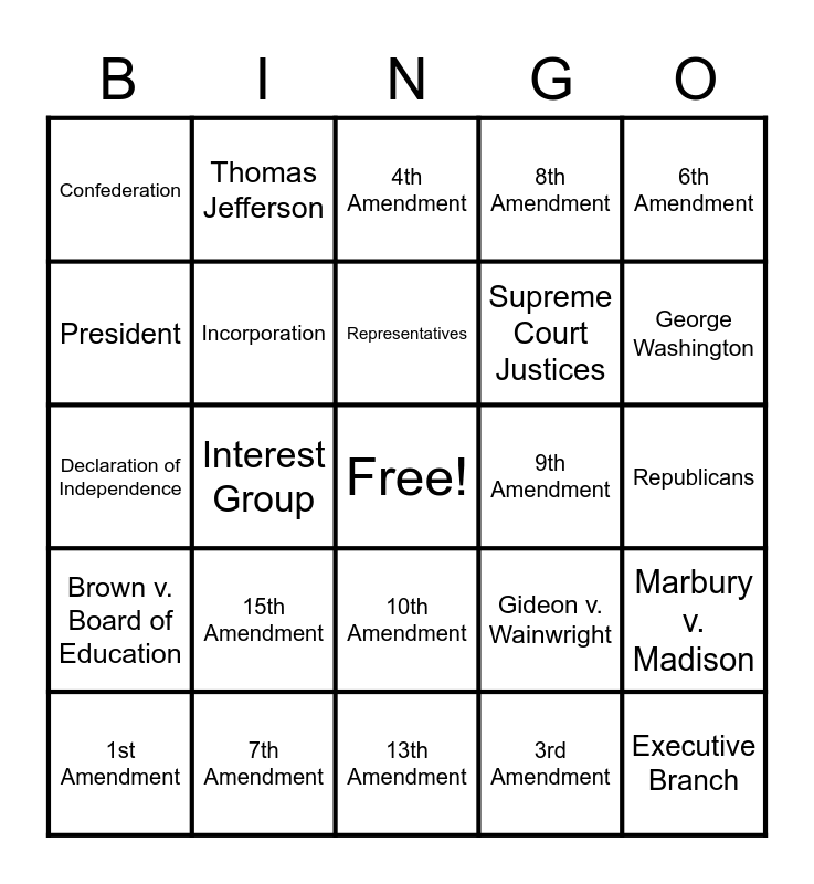 This bingo card has a free space and 44 words: Legislative Branch, Executive Branch, Judicial Branch, 1st Amendment, 2nd Amendment, 3rd Amendment, 4th Amendment, 5th Amendment, 6th Amendment, 7th Amendment, 8th Amendment, 9th Amendment, 10th Amendment, 15th Amendment, 19th Amendment, 13th Amendment, 14th amendment, Declaration of Independence, Federalist Papers, George Washington, Thomas Jefferson, Federalism, Dictatorship, Confederation, Democrats, Republicans, Separation of Powers, Checks and Balances, Gideon v. Wainwright, Brown v. Board of Education, McCulloch v. Maryland, Marbury v. Madison, Suffrage, Political Party, Interest Group, Electoral College, Primary Elections, Senators, Representatives, President, Supreme Court Justices, General Election, Incorporation and The Constitution.