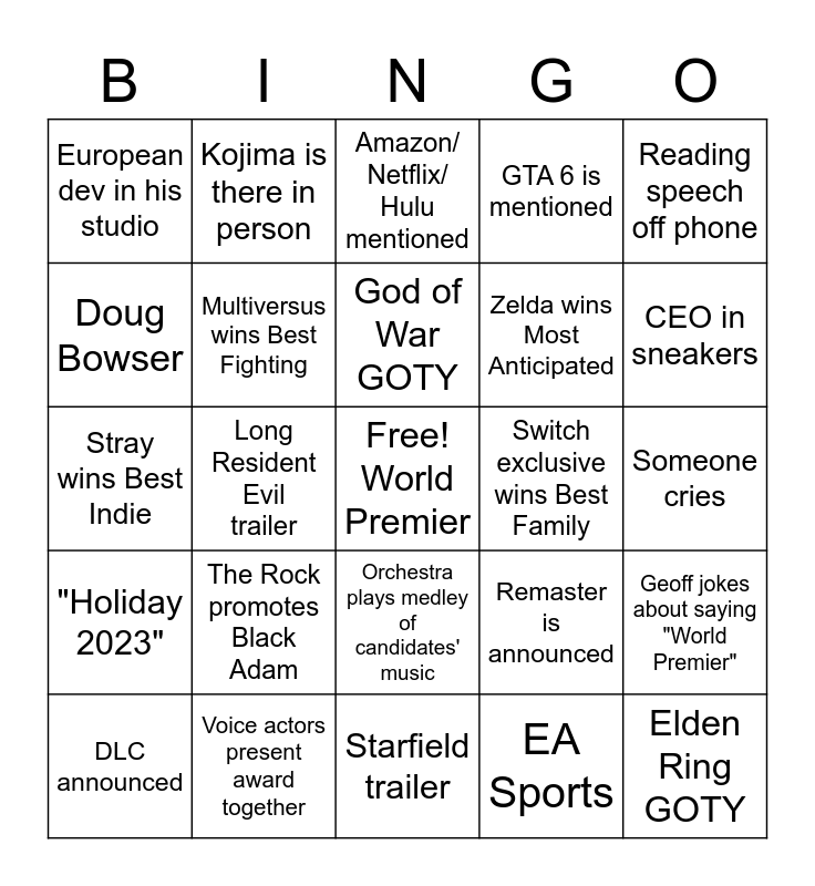This bingo card has a free space and 24 words: The Rock promotes Black Adam, Voice actors present award together, God of War GOTY, DLC announced, Reading speech off phone, European dev in his studio, Doug Bowser, Kojima is there in person, Switch exclusive wins Best Family, Orchestra plays medley of candidates' music, Zelda wins Most Anticipated, Stray wins Best Indie, Remaster is announced, Geoff jokes about saying "World Premier", Multiversus wins Best Fighting, EA Sports, Someone cries, Amazon/ Netflix/ Hulu mentioned, CEO in sneakers, Long Resident Evil trailer, Elden Ring GOTY, "Holiday 2023", GTA 6 is mentioned and Starfield trailer.