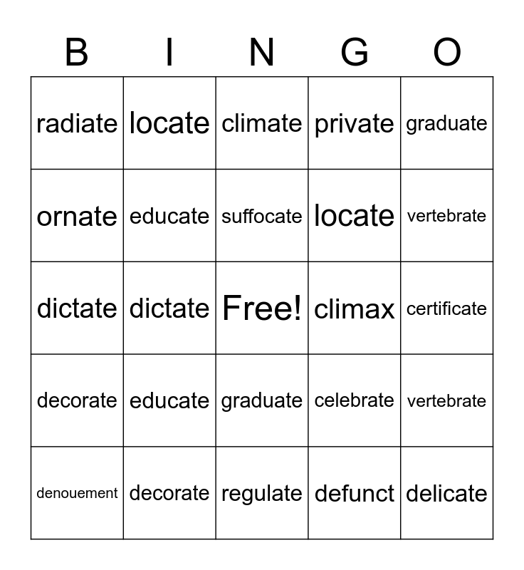 ⚠ This card has duplicate items: dictate (2), decorate (2), educate (2), graduate (2), vertebrate (2), locate (2), radiate (2), suffocate (2), climate (2)