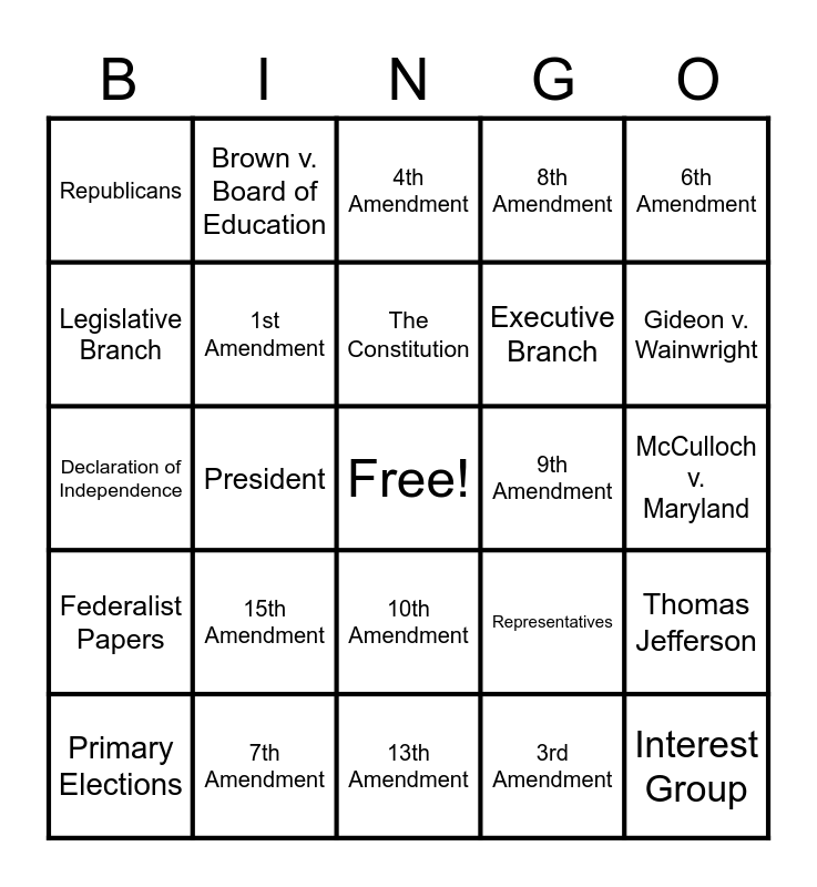 This bingo card has a free space and 44 words: Political Party, Interest Group, Electoral College, Primary Elections, Senators, 3rd Amendment, 4th Amendment, 5th Amendment, 6th Amendment, 7th Amendment, 8th Amendment, 9th Amendment, 10th Amendment, 15th Amendment, 19th Amendment, 13th Amendment, 14th amendment, Declaration of Independence, Checks and Balances, Gideon v. Wainwright, Brown v. Board of Education, Confederation, Democrats, Republicans, Separation of Powers, McCulloch v. Maryland, Marbury v. Madison, Suffrage, Representatives, Federalist Papers, George Washington, Thomas Jefferson, Federalism, Dictatorship, President, Supreme Court Justices, General Election, Incorporation, The Constitution, Legislative Branch, Executive Branch, Judicial Branch, 1st Amendment and 2nd Amendment.